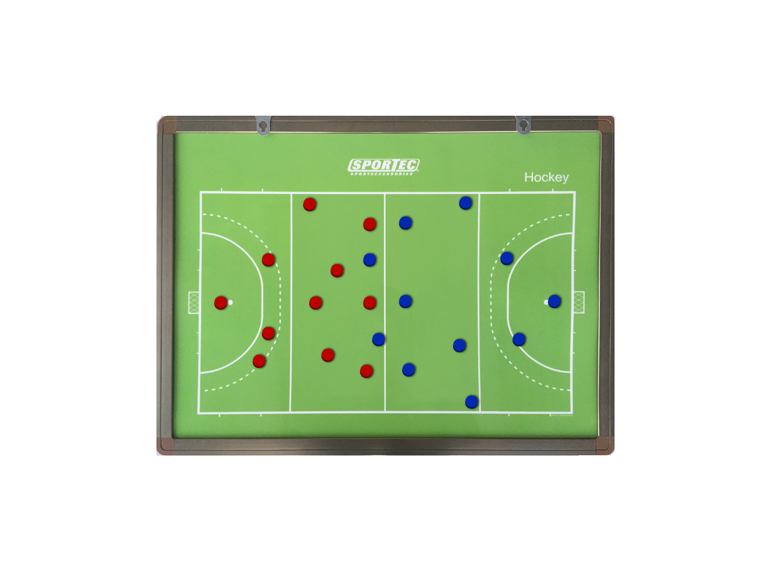 Dit magnetisch coachbord kan opgehangen worden. Het bord is eventueel aan beide kanten te gebruiken, de ene zijde geeft een speelveld weer, de andere zijde is blanco. Wordt geleverd inclusief platte genummerde magnetische pionnen, schoonmaakborstel en een stift (platte genummerde pionnen wijken af van de afbeelding).