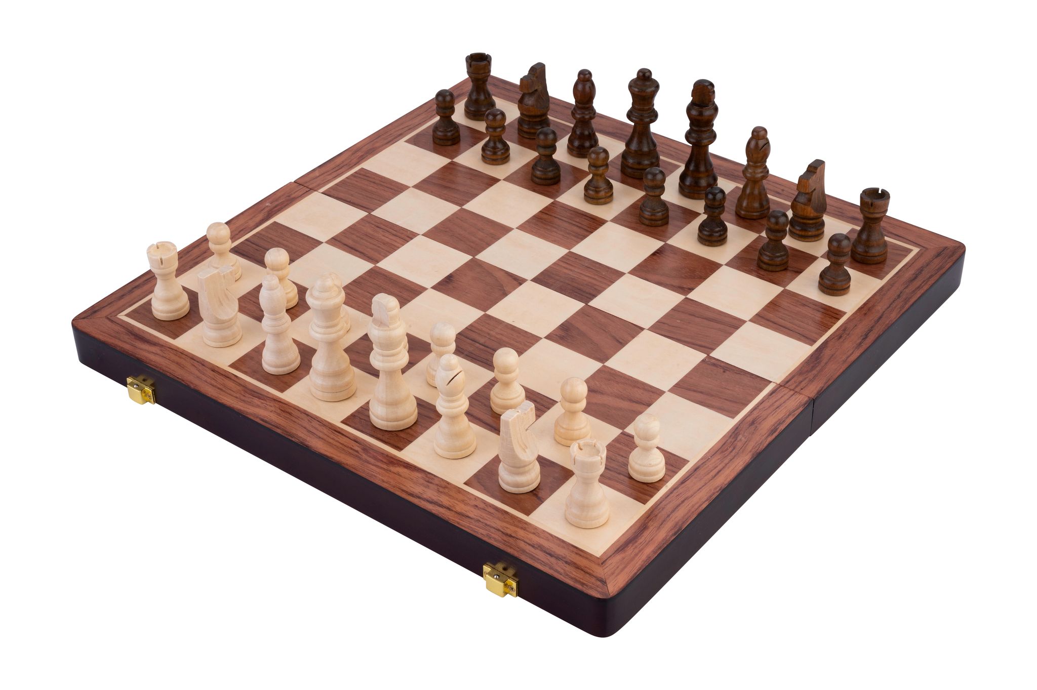 Houten schaak / backgammon opklapbare set gemaakt van essenhout. De speelstukken kun je opbergen in het bord zelf. Afmeting: 38,5 x 38,5 x 5,5 cm